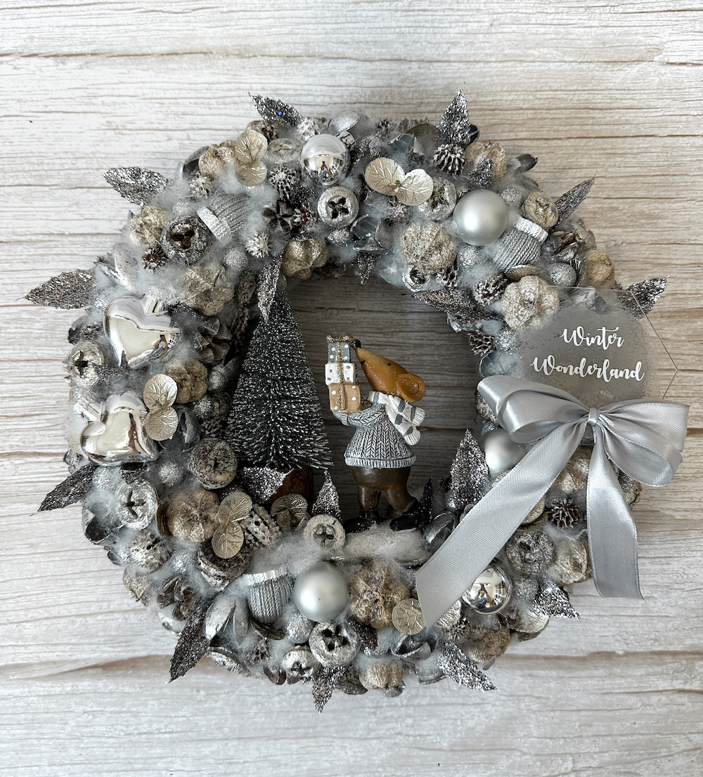 Dobd fel az otthonod hangulatát ezzel a különleges, kézzel készült adventi koszorúval, amely egy igazi karácsonyi mesét idéz meg. Az adventi koszorút természetes tobozok, termések, kisméretű ezüst üveggömbök, csillogó ezüst díszek, egy egérke fenyőfával és egy plexi tábla díszít.