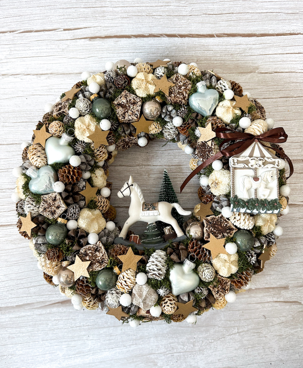 Dobd fel az otthonod hangulatát ezzel a különleges, kézzel készült karácsonyi ajtódísszel, amely egy igazi karácsonyi mesét idéz meg. Az ajtódíszt természetes tobozok, termések, apró üveg karácsonyfadíszek, egy kerámia hintaló fenyőfával és egy lovacskás körhinta díszíti. Az ajtón vagy akár a falon elhelyezve lenyűgöző látványt nyújt.