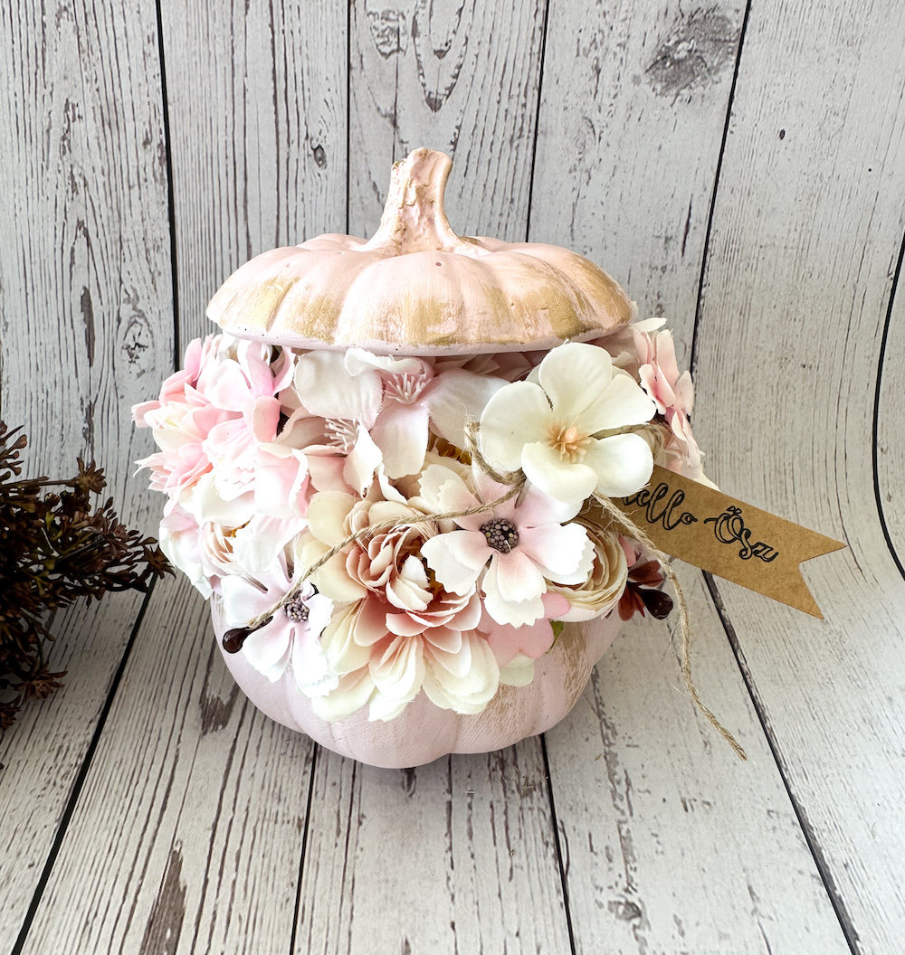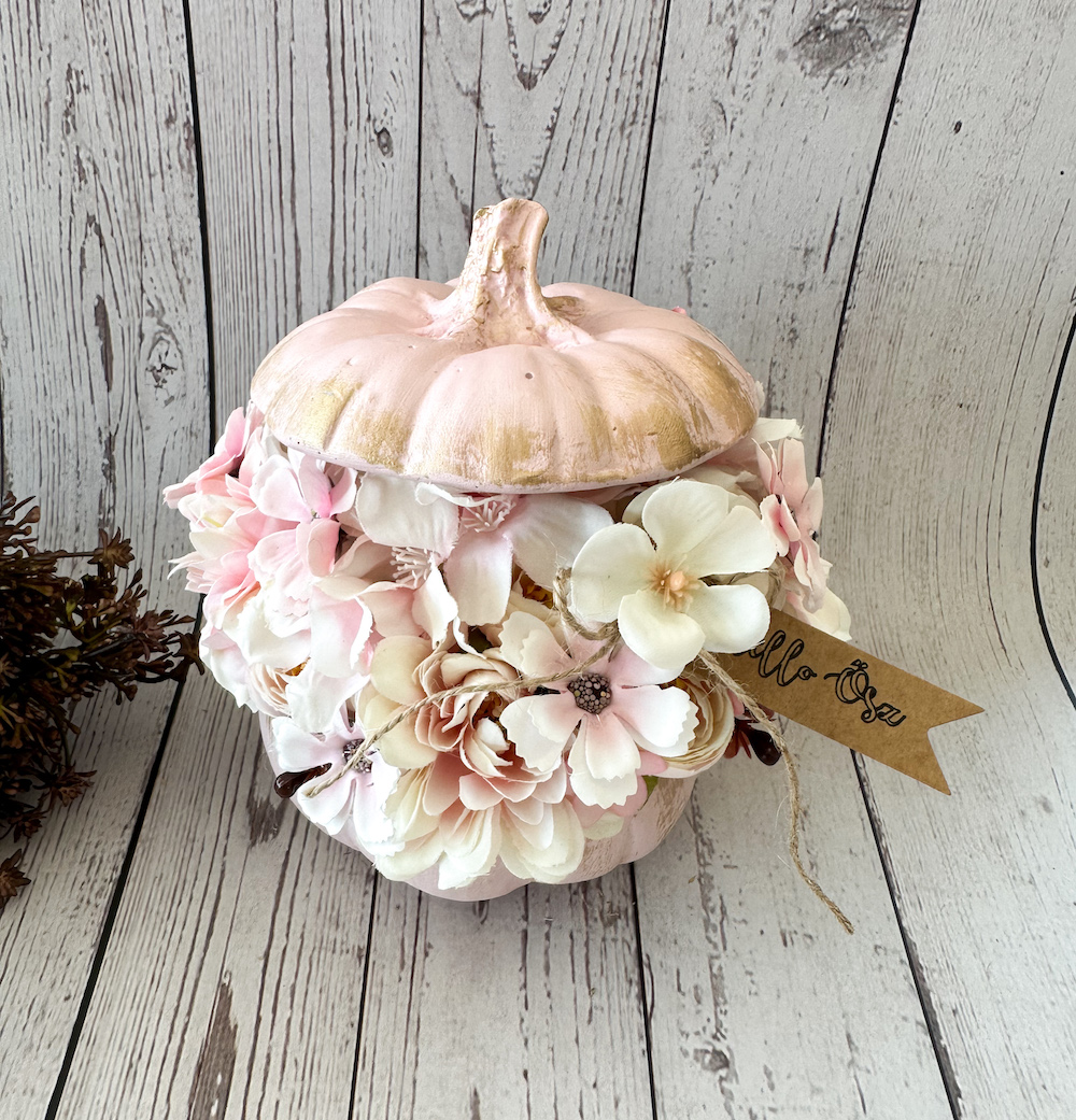 Kézzel készült őszi asztaldísz. Kisméretű rózsaszín-arany kerámia tökben, rózsaszín-fehér selyemvirágokkal. Minden díszből csak 1-1 darab készül!