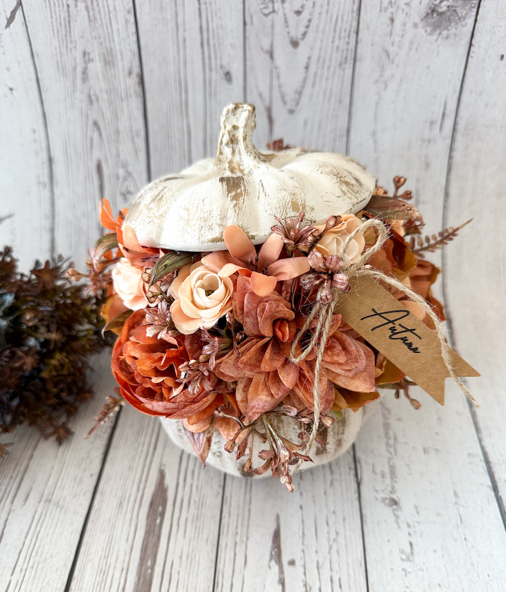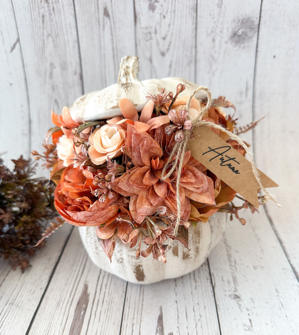 Kézzel készült őszi asztaldísz. Kisméretű krémszínű-arany kerámia tökben, barna-narancs selyemvirágokkal. Minden díszből csak 1-1 darab készül!